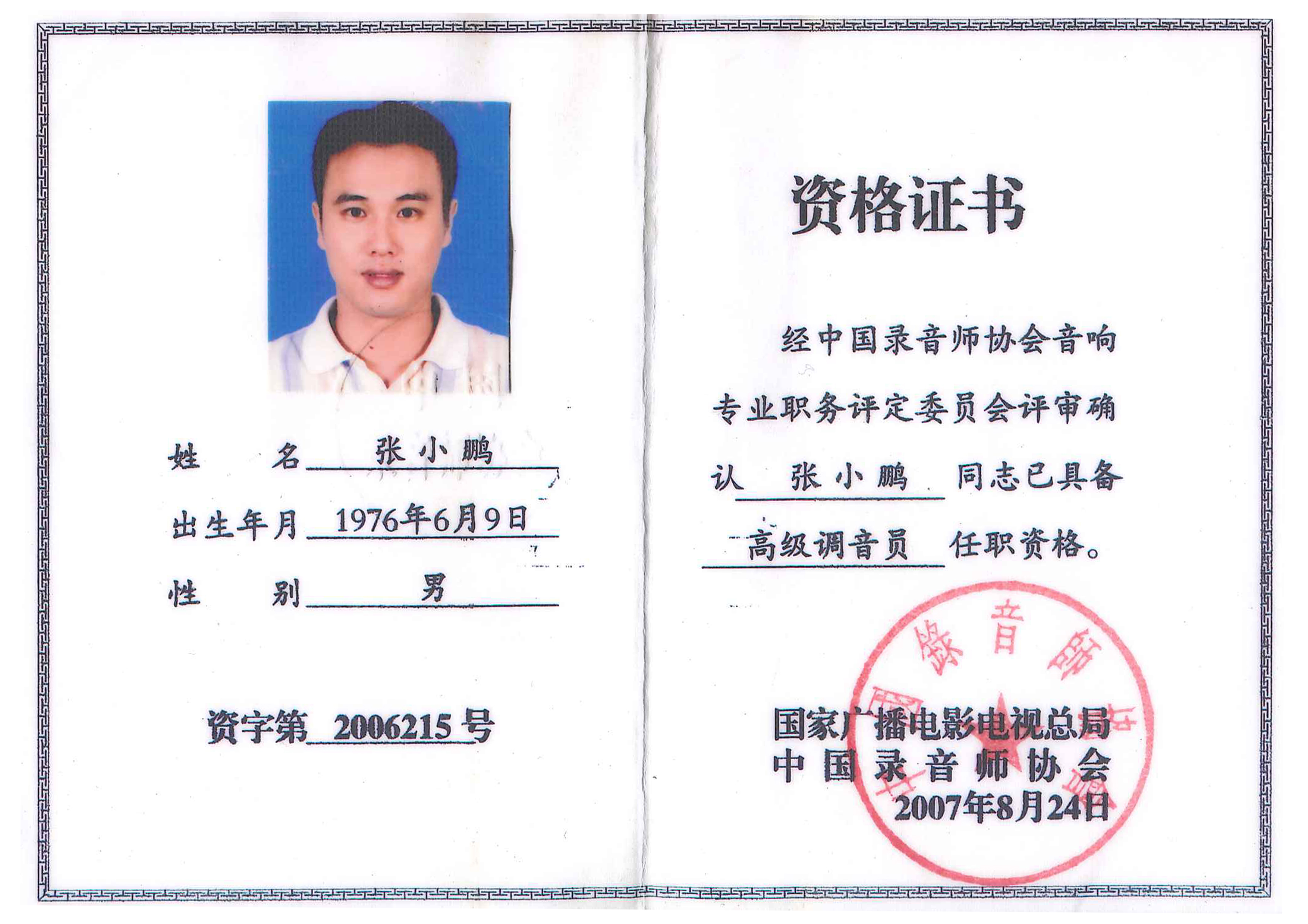 中國錄音師協會認證:專業音響高級調音師